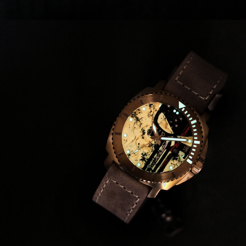 This custom dial features a customized skull (punisher, thin-red-line) on dial with lume.